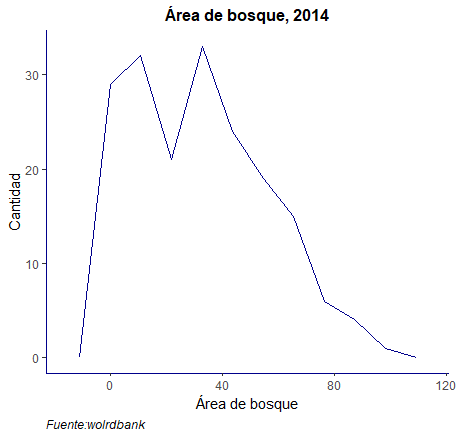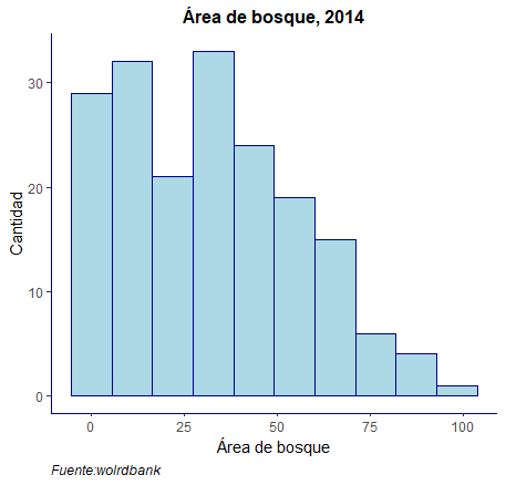 ggplot(data = worldbank, aes(x = Forest_area)) + geom_histogram(bins = 10, color = "darkblue", fill = "lightblue") + xlab("Area de bosque") + ylab("Cantidad") + labs(title = "Area de bosque, 2014", caption = "Fuente: wolrdbank")+ theme(plot.title = element_text(size = 12, face = "bold", hjust = 0.5), plot.caption = element_text(face = "italic", hjust = 0), panel.background = element_rect(fill = "white"), panel.border = element_blank(), legend.position = "none", axis.line = element_line(color = 'darkblue'))