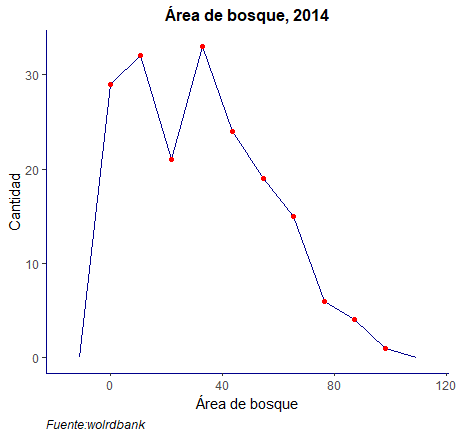 ggplot() + geom_freqpoly(data= worldbank,aes(x=Forest_area), bins = 10,color= "darkblue") + geom_point(aes(infoHist$data[[1]]$x,infoHist$data[[1]]$y),color="red") + xlab("Area de bosque") + ylab("Cantidad") + labs(title = "Area de bosque, 2014", caption = "Fuente: wolrdbank")+ theme(plot.title = element_text(size = 12, face = "bold", hjust = 0.5), plot.caption = element_text(face = "italic",hjust = 0), panel.background = element_rect(fill = "white"), panel.border = element_blank(), legend.position = "none", axis.line = element_line(color = 'darkblue'))