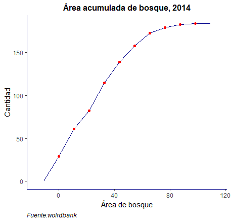 ggplot() + geom_freqpoly(data = worldbank, aes(x = Forest_area, y = cumsum(..count..)), bins = 10, color = "darkblue") + geom_point(aes(infoHist$data[[1]]$x, cumsum(infoHist$data[[1]]$y)), color = "red") + xlab("Area de bosque") + ylab("Cantidad") + labs(title = "Area acumulada de bosque, 2014", caption = "Fuente: wolrdbank")+ theme(plot.title = element_text(size = 12, face = "bold", hjust = 0.5), plot.caption = element_text(face = "italic",hjust = 0), panel.background = element_rect(fill = "white"), panel.border = element_blank(), legend.position = "none", axis.line = element_line(color = 'darkblue'))