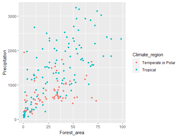 Por otro lado, aesthetics tiene varios atributos que pueden ser de gran utilidad, por ejemplo, el color, la forma y el tamaño. En el caso del ejemplo de la Figura 1 en el cual se graficaron los valores de las variables Forest_area y Precipitacion con puntos, se puede agregar color para cada punto según el clima de la región (ver Figura 3). Una instrucción que permite asignar el color a cada punto es la siguiente: