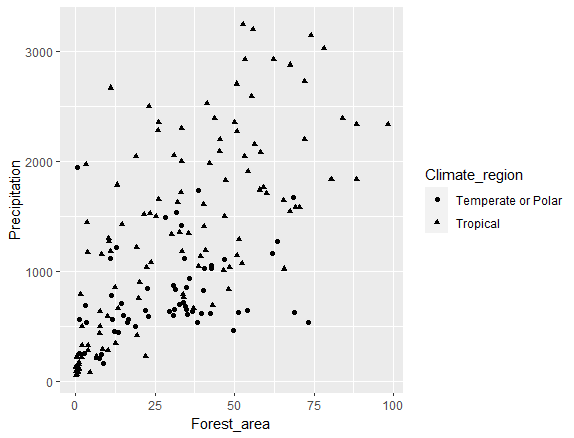 ggplot(data = worldbank, aes(x = Forest_area, y = Precipitation, shape = Climate_region)) + geom_point()