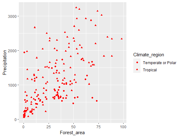 ggplot(data = worldbank, aes(x = Forest_area, y = Precipitation, shape = Climate_region)) + geom_point(color = "red")