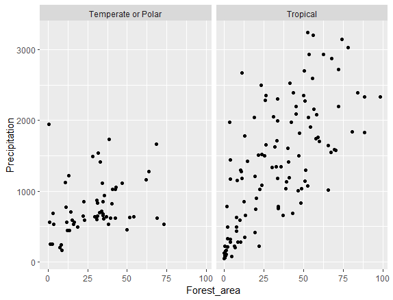 ggplot(data = worldbank, aes(x = Forest_area, y = Precipitation)) + geom_point() + facet_wrap(~ Climate_region)