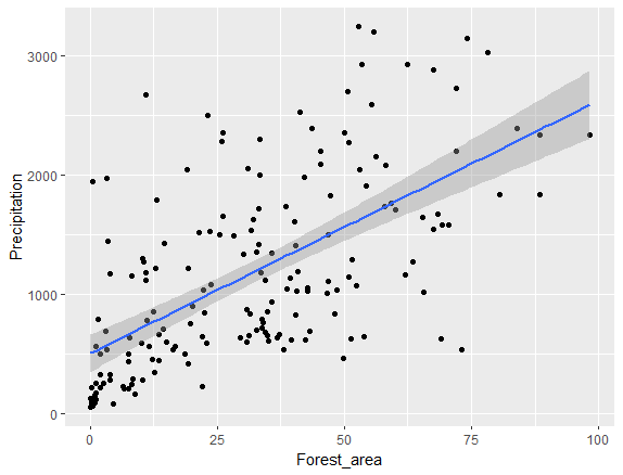 ggplot(data = worldbank, aes(x = Forest_area, y = Precipitation)) + geom_point() + geom_smooth(method = "lm")