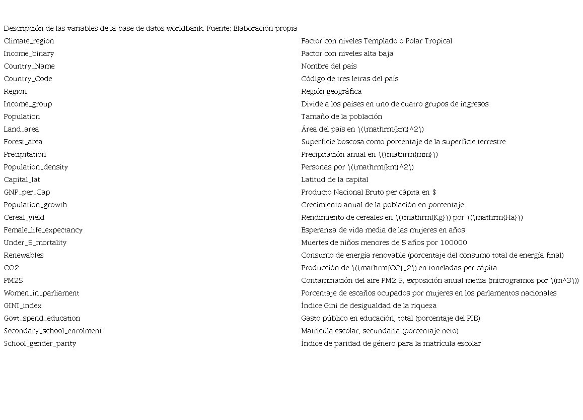 El paquete Biostatistics proporciona diferentes bases de datos, en este documento se utiliza la base de datos llamada worldbank que presenta una variedad de medidas geográficas, económicas, ambientales y sociales para 186 países desde el año 2014, recopiladas a partir de datos publicados por World Bank, los cuales se pueden obtener y verificar en la dirección https://www.worldbank.org/en/home. La descripción de las variables que presenta esta base de datos se muestra en la tabla 1.