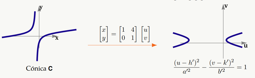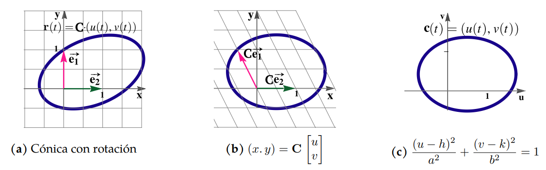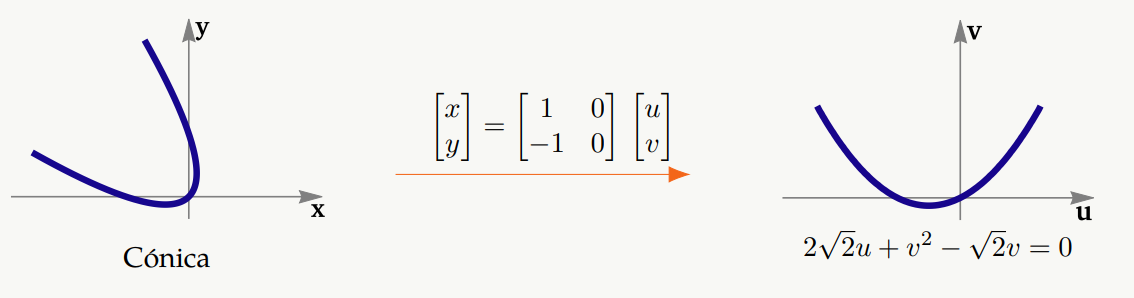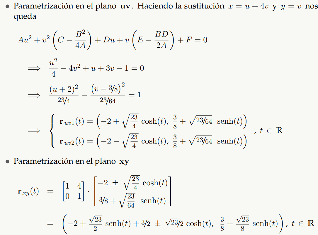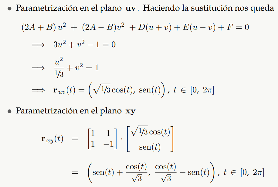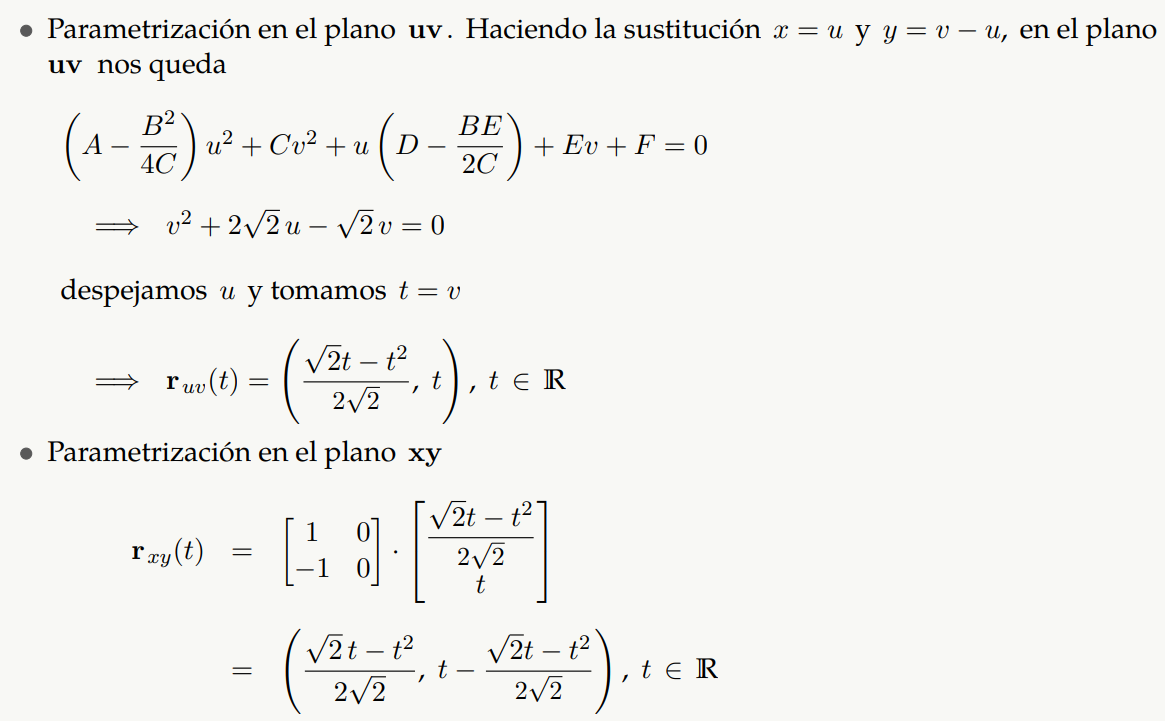 Al aplicar un cambio de variable adecuado1 podemos obtener la ecuación canónica de la cónica en el plano uv y por tanto una parametrización en este plano. Entonces una parametrización en el sistema xy es