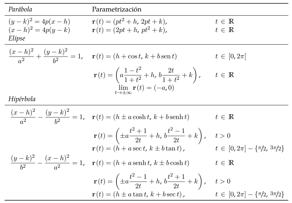 En la tabla 1 se enumera algunas parametrizaciones usuales (trigonométricas y "racionales") de las cónicas propias, en posición estándar.