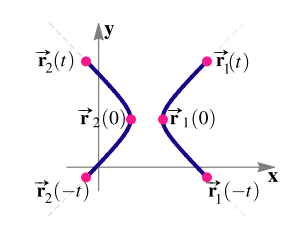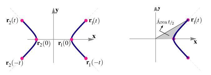 Elaboración propiaLa parametrización de la hipérbola usando las funciones hipérbolicas (ver apéndice B), no presentan singularidades y gozan de simetría. En este caso t no es un ángulo, más bien (en el caso de una hipérbola centrada en el origen) es dos veces el área (orientada) de la región entre la hipérbola, el eje focal y un rayo del origen al punto P=r(t) (ver Figura 1)