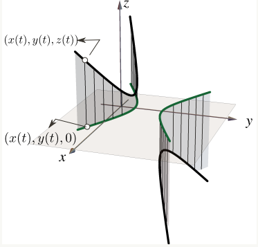 Como antes, parametrizamos la proyección de la curva con y como entonces: