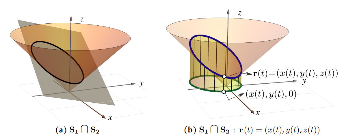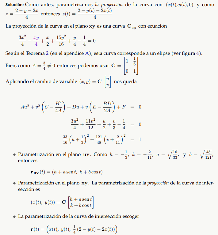 En el ejemplo 8 se presenta una forma para determinar una parametrización trigonométrica de la curva de intersección entre un cono y un plano. En este caso, la proyección de la curva de intersección presenta rotación, por lo que, como el propósito es solo parametrizar, podemos usar diagonalización no ortogonal.