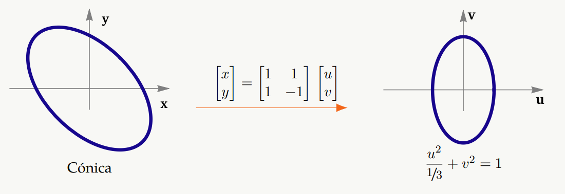 Los cambios de variable en realidad son transformaciones. En este caso necesitamos transformaciones afines que envían cónicas con rotación en cónicas de la misma clase, en posición estándar, aunque no necesariamente congruentes.