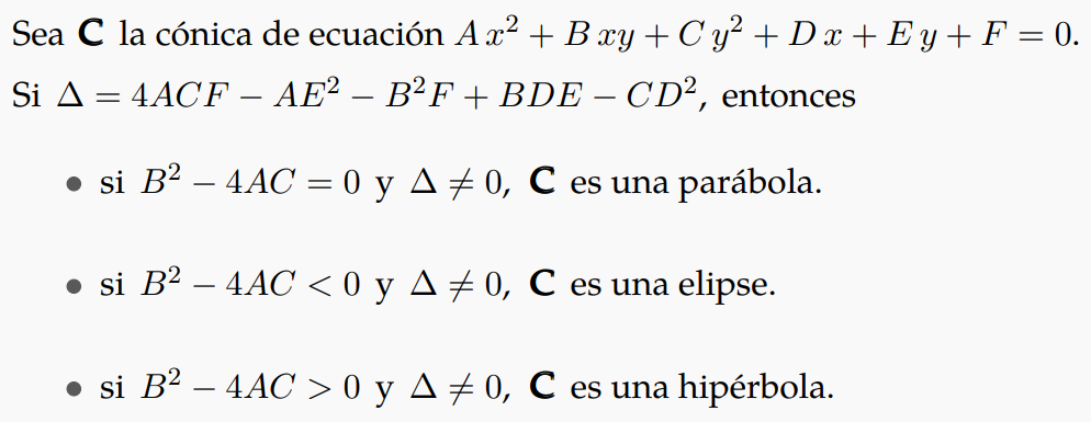 Usando la teoría de formas cuadráticas podemos obtener un criterio para clasificar las cónicas a partir de su ecuación general (Marsh, 2005)