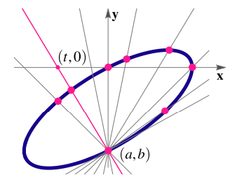 Una "parametrización racional" de una curva es una parametrización en terminos de cocientes de polinomios. Estas parametrizaciones son muy útiles en muchos contextos, como el de gráficos por computadora, modelado geométrico, ecuaciones diofánticas, cambios de variable en integración, etc. Las cónicas tienen la propiedad de que cada par de puntos en ella, se pueden obtener por intersección con una línea recta. La idea básica consiste en utilizar un "lápiz o haz de líneas rectas" que pasan por un punto (a,b) de la curva, de manera que al calcular el otro punto de intersección de cada recta genérica del "haz", con la curva, se determina una parametrización de la curva (excepto por uno o dos puntos). Cada línea del "haz" depende de un parámetro t que será el parámetro de la parametrización de la curva (ver figura 9).