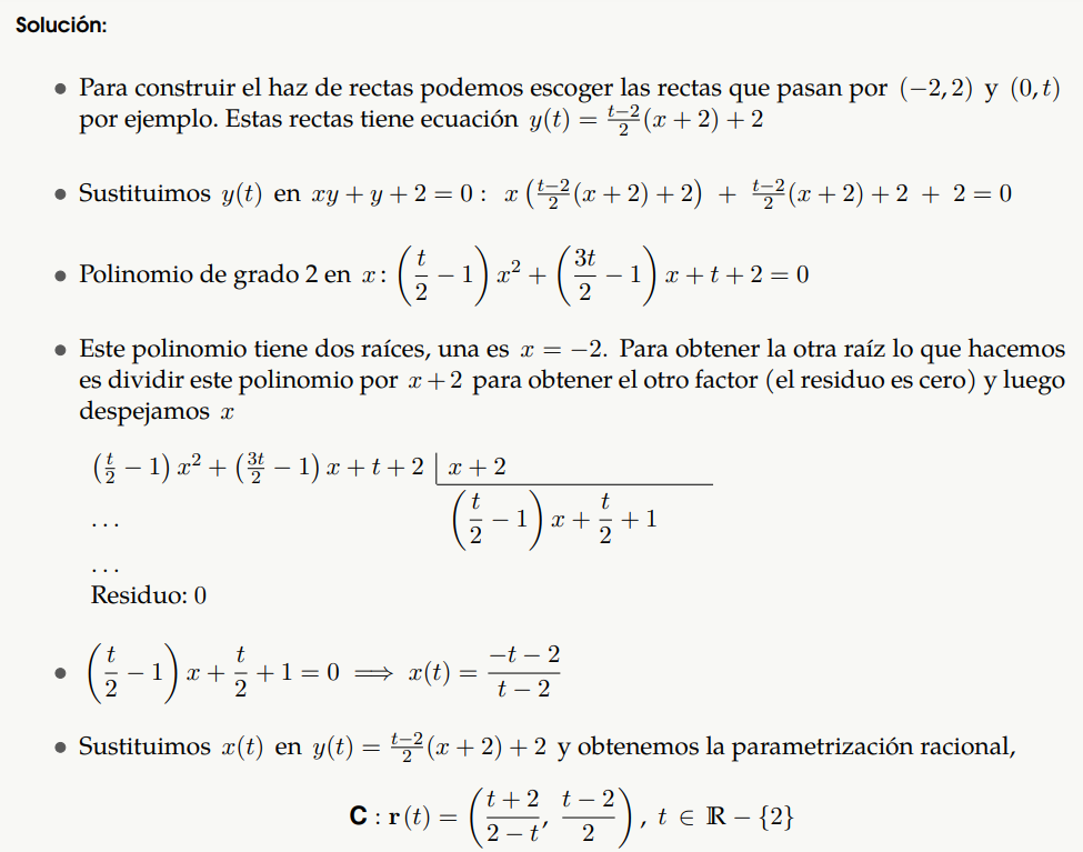 Una parametrización racional es una parametrización de la forma donde , son polinomios. Un método para obtener parametrizaciones racionales de una cónica lo veremos en la sección 3.