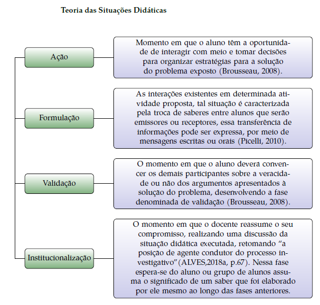 Dessa forma, com o intuito de garantir uma perspectiva teórica bem fundamentada para a discussão do nosso objeto de estudo, se utilizou a TSD na elaboração de situações didáticas, em que ocorreu uma previsão das das fases da teoria (ação, formulação, validação, institucionalização), tencionando a identificação da manifestação de um pensamento intuitivo do aluno. Teoria das Situações Didáticas (TSD)
