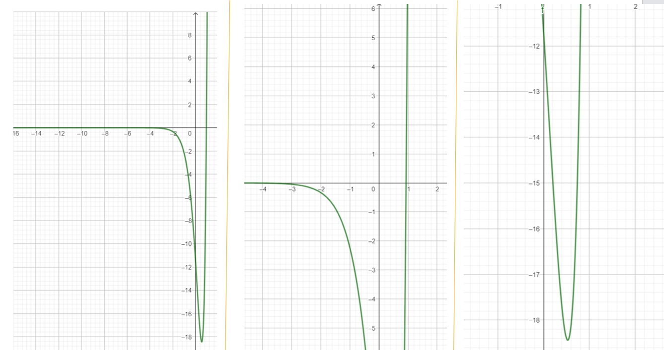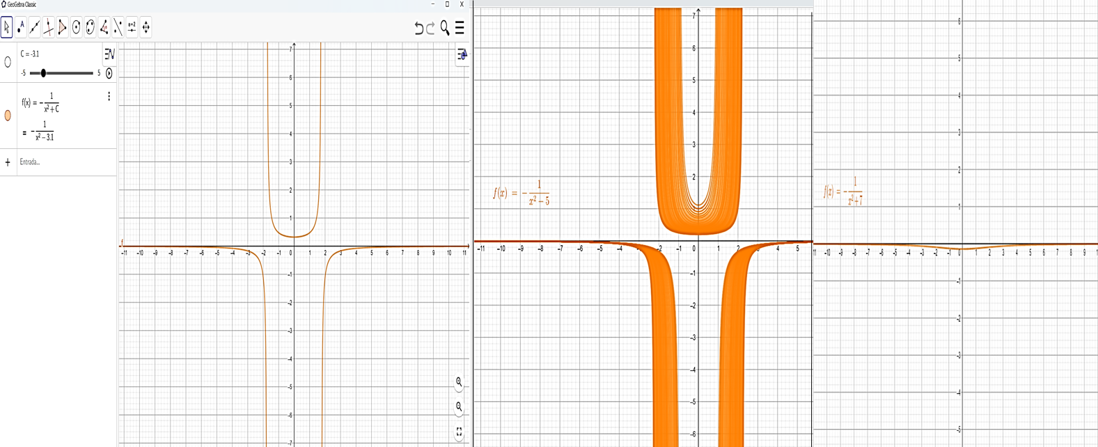 Exemplificação de uma solução de equação diferencial de primeira ordem, na primeira imagem (á esqueda) temos a solução quando a constante c=-8, na segunda imagem exibimos o rastro para um controle deslizante para a constante C variando de -20 a 20, e por fim, na direita, temos a solução da equação quando c=7