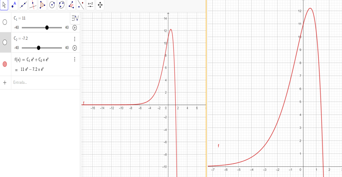 Por meio dessa segunda situação, podemos trabalhar com os alunos a fórmula da equação geral da solução da EDO homogênea de segunda ordem com base na natureza do . Além disso, podemos utilizar os mecanismos dinâmicos do Geogebra para estabelecer condições iniciais a EDO trabalhada e estabelecer assim, soluções singulares, que trata-se exatamente da função g(x) exibida na Figura 5.