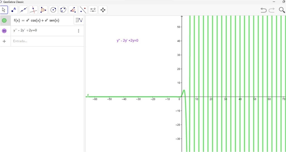 Por fim, o caso em que . Observe que nessa última situação didática, a solução da EDO não pertence mais aos números reais, nesse caso, a solução da equação diferencial passa a compor o corpo dos números complexos, o que justifica a periodicidade da solução das funções, conforme exibido na Figura 6. Nesse caso, a visualização se torna um fator fundamental para a compreensão e diferenciação das soluções de uma equação diferencial de segunda ordem.