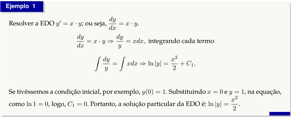 Por fim, se aplicar as condições iniciais, se fornecidas, em que e são valores conhecidos, desse modo essas informações determinam solução única da EDO (solução particular). Para isso, se substitui as condições iniciais na solução geral encontrada anteriormente e se resolve para quaisquer constantes desconhecidas que apareçam na equação (Figueiredo e Neves, 1979).