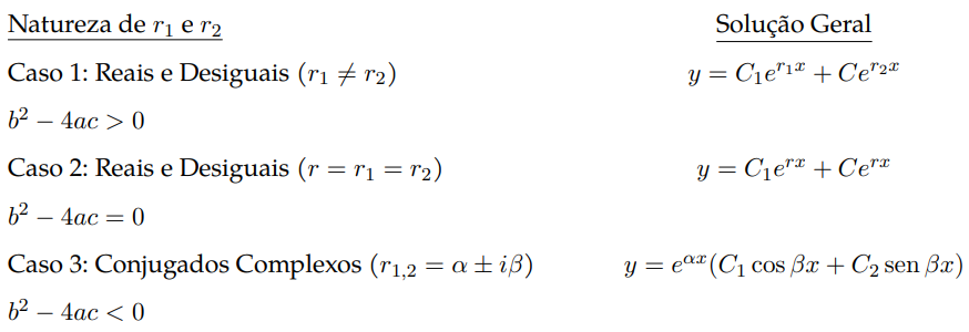 que intitularemos equação característica da equação diferencial de número 5 e suas raízes r relacionadas à natureza do delta da equação do segundo grau em função de r (Boyce e DiPrima, 2020).