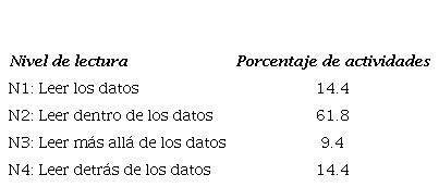 Niveles de lectura: facilitan la elección del nivel de dificultad que se tenía en mente para cada una de las actividades (Díaz-Levicoy et al., 2017). Fueron considerados los niveles propuestos por Cursio (1989) y Friel et al. (2001), específicamente: N1. Leer los datos; N2. Leer dentro de los datos; N3. Leer más allá de los datos y N4. Leer detrás de los datos.