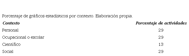El libro confeccionado presenta porcentajes muy similares para los contextos personal, ocupacional o escolar y social en las actividades con gráficos estadísticos. La información se puede observar en la tabla 2.