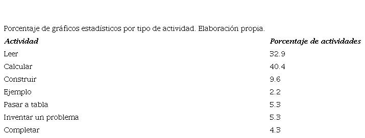 En la tabla 3 se nota que la actividad más presentada en relación con los gráficos estadísticos es la de calcular, lo que implica manipular datos junto con operaciones aritméticas. Seguidamente, con mayor frecuencia aparecen las de leer el gráfico y las de construir.