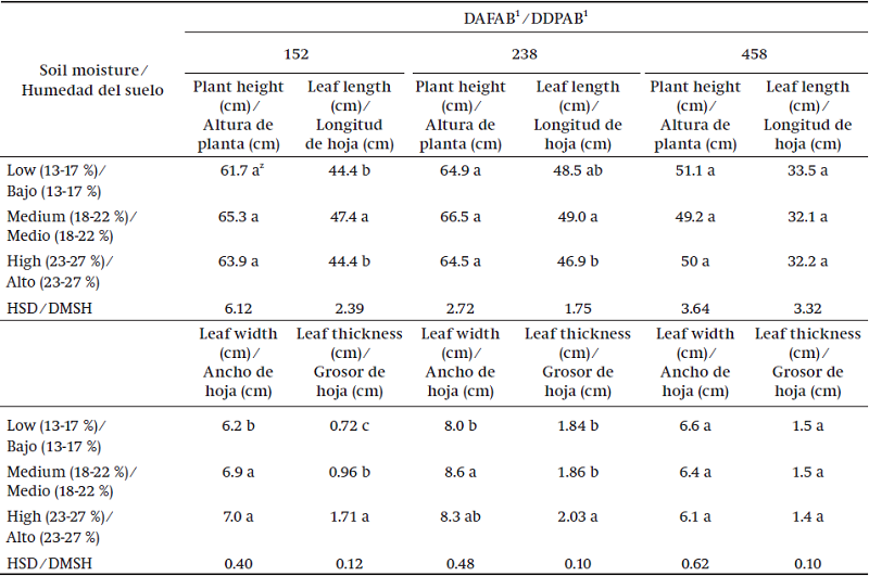 In Table 1 it can be seen that the height of the plant did not show significant statistical differences (P ≤ 0.05) due to soil moisture at any of the three evaluation dates. On the other hand, leaf length and width were greater at 152 and 238 DAFAB with the medium soil moisture content (18 to 22 %). Leaf thickness showed statistical differences (P ≤ 0.05) among the different moisture treatments, with the high content (23 to 27 %) obtaining the greatest thickness at the first two evaluation dates. At 458 DAFAB there was no difference between the three soil moisture levels for any of the variables evaluated, which could be indicative of aloe’s tolerance to water stress.