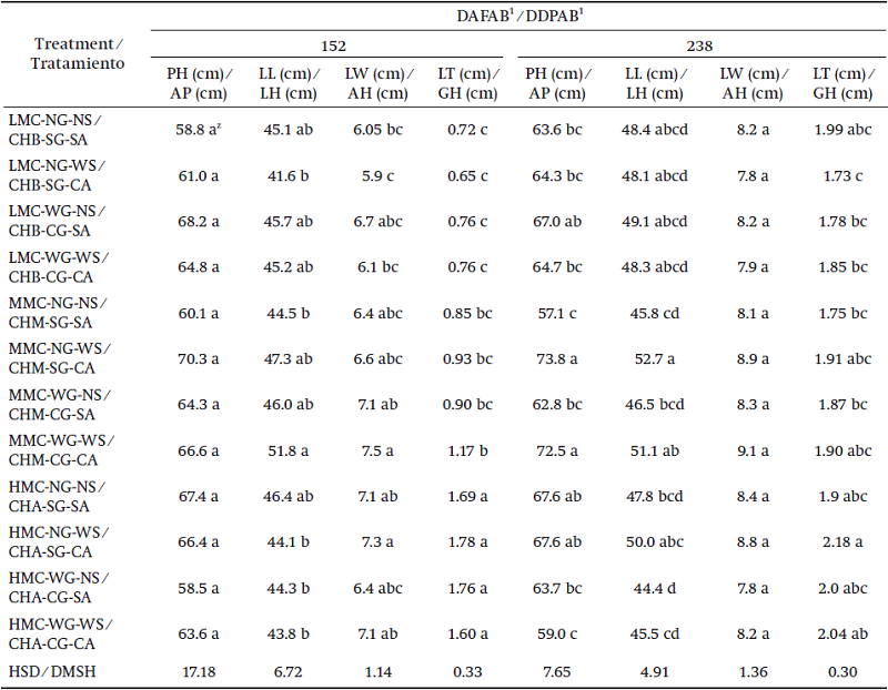 The absence of effect in the majority of the variables measured when using guano could be related to the dose used in this study. According to Cardarelli et al. (2013), when guano doses were doubled, from 4 to 8 g∙L-1, it resulted in greater plant height, a higher number of leaves, and greater fresh and dry weight of aloe leaf (A. barbadensis and A. arborescens). The above could suggest that the doses evaluated in this study were below the level required by the plant.
