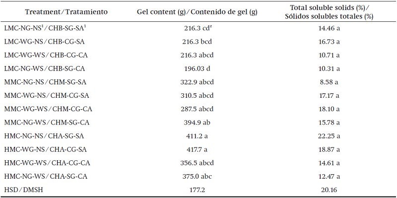 The amount of gel produced was higher (417.7 g) in the high moisture content, without presenting significant statistical differences (P ≤ 0.05) with the medium moisture content (394.9 g; Table 6). This is consistent with what was reported by Rodríguez-García, Jaso-de Rodríguez, Gil-Marín, Angulo-Sánchez, and Lira-Saldivar (2007), who obtained the highest yield when the plant had no water stress, with a soil moisture content of 27 %; in addition, they observed a significant decrease in drought conditions.