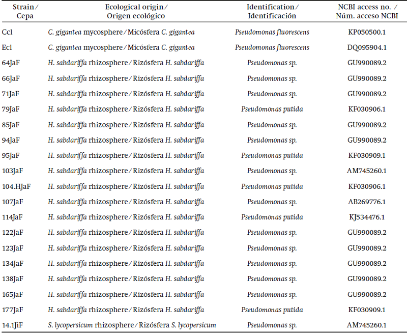 With the amplification of the 16S rRNA gene from the 20 bacterial strains by means of primers FD1 and RD1, a fragment of approximately 1,500 bp was obtained. The sequencing and alignment of these strains in the NCBI identified 13 (65 %) as Pseudomonas sp., 5 (25 %) as P. putida and 2 (10 %) as P. fluorescens (Table 2).
