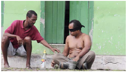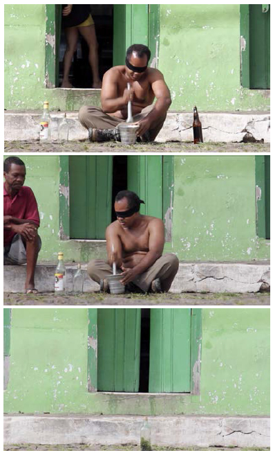 Dalton Paula caminha pelas ruas de Lençóis (BA), sem camisa, pilão, duas garrafas de cachaça e um ramo de Guiné às mãos. É manhãzinha, os primeiros turistas aparecem e o comércio começa a abrir suas portas. O artista assenta-se na rua de pedra, recostado ao meio fio e inicia diligentemente a preparação do unguento (garrafada, na expressão popular), como mostra a Figura 1. Em planos fixos de longa duração, a câmera o acompanha em seu rito solitário: de início, ele venda os próprios olhos. Depois, o artista parece evocar a proteção de Exu ao fazer uma breve oferenda, respingando um pouco de cachaça em torno de si. Começa então a pilar a Guiné, planta também chamada de Amansa senhor, já que doses da erva eram ministradas nas bebidas da casa grande, gerando um envenenamento lento e silencioso que gerava distúrbios mentais, mal-estar, inanição e até a morte dos senhores1. Ouvimos algumas perguntas e comentários vindos do extracampo, acusando a presença da câmera e da equipe de filmagem em uma ação performática que abre ali, entre o trânsito dos carros e o comércio da cidade turística, um tempo e um espaço próprios.