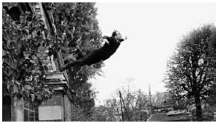 Como bom vanguardista, Klein é, de fato, um artista destemido, o que se explicita quase literalmente em outra obra, uma fotografia na qual ele se lança da janela de um prédio, como se pudesse voar. Esse “salto sobre o vazio”19 parece confiar menos no espaço do que no tempo: ele aposta em um futuro aberto à invenção, que exige, para tanto, liberar-se do peso do corpo, da experiência e da tradição. Para lembrar as conhecidas categorias com que Reinhart Koselleck (2006) caracteriza o progresso moderno, o horizonte de expectativa alarga-se na medida em que se desvencilha do espaço de experiência: “As expectativas para o futuro se desvincularam de tudo quanto as antigas experiências haviam sido capazes de oferecer”. Em Le saut dans le vide, a fotografia é montada, forjada para demonstrar ou comprovar a possibilidade deste salto em direção a um futuro livre do fardo do passado (ainda que seja preciso, de fato, reconhecer a ironia presente no trabalho de Klein).