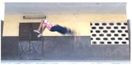 É outro o salto em Noirblue: em determinado momento do filme, Ana Pi encontra-se com os Gênios de Babi (Les Génies de Babi), aprende com eles alguns passos (Figura 15) e filma uma longa e bela sequência da dança que chamam de Roukaskass. Na batalha em freestyle, uns “passam a bola” aos outros, saltam e giram em uma coreografia marcada pelo improviso, habilidade e inventividade da dança de rua. Às vezes, o salto se lança adiante para ser amortecido com os braços e o peito; noutras, é um “mortal” para trás (Figura 17). A dança urbana dos Gênios de Babi, assim como as performances de Ana Pi, parecem retirar sua força de sua invenção da tradição negra e popular que informa, explicita ou subterraneamente, as manifestações do hip hop.