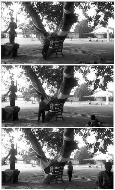 Se, na performance de Dalton Paula, o corpo está “assentado”, concentrado, no gesto de pilar a planta, em L’arbre d’oublier (A árvore do esquecimento, 2013)3, Paulo Nazareth caminha, circula a árvore numa praça aparentemente pacata de Uidá, no Benin. Ele o faz, contudo, ao revés (Figura 4). O círculo será, em certo sentido, traço comum a ambas as performances, dado o gesto circular com que Dalton Paula espalha a cachaça em torno de si: com isso, ele circunscreve um espaço de proteção e, ao mesmo tempo, de passagem.