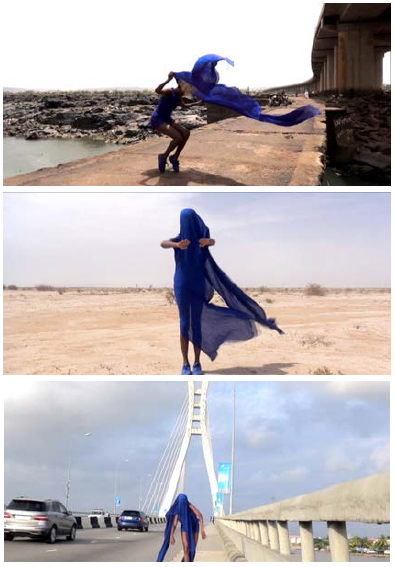 Assim como em L’arbre d’oublier, trata-se de um retorno a África, nesse caso, a África Subsaariana, que Ana Pi visita para, como ela mesmo diz, desfazer as voltas que foram feitas à força na Árvore do Esquecimento. Em sua performance, Ana Pi dança, enlaçada a um véu azul, em espaços das várias cidades por onde passa (Figuras 7, 8 e 9).