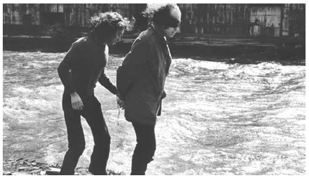 Em Security Zone, conhecida performance de 1971, Vito Acconci caminha de olhos vendados sobre o pier 18 de East River, em Nova Iorque. Nas fotografias da performance13, o vento parece intenso e as águas revoltas, o que sugere uma situação de risco e instabilidade. Acconci é guiado por alguém que convidou para a performance por conta não da confiança, mas da desconfiança que nutrem um pelo outro.