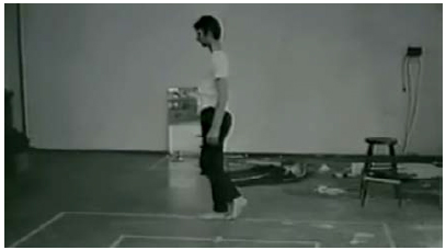 Em Walking in an exaggerated manner around the perimeter of a square, de 1967, Bruce Nauman anda exagerando os trejeitos sobre as linhas de um quadrado, no interior de seu estúdio. Registrado por uma câmera de 16 mm, o caminhar avança, retrocede e, vez ou outra, se duplica no espelho situado discretamente ao fundo da sala (Figura 12).