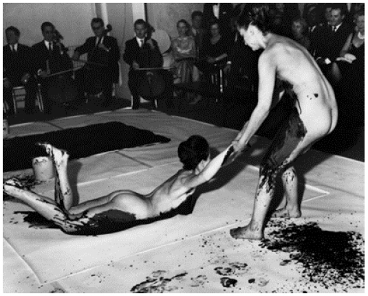A performance é conhecida: enquanto uma orquestra - Monotone Symphony - toca a música de 20 minutos de uma única nota, seguidos de 20 minutos de silêncio, Yves Klein dirige a produção de sua Anthropometries, uma série de quadros monocromáticos pintados por meio do corpo de modelos nuas (Figura 14). O resultado são pinturas abstratas em grande escala, nas quais se inscreve o movimento das modelos sobre o papel. Muito já se disse sobre esse trabalho de inquestionável importância para a história da arte, integrando-se pioneiramente em várias frentes da vanguarda tardo-moderna (a pintura monocromática, o abstracionismo, a action painting, a arte da performance). Não sem razão, muitas críticas também já se endereçaram à obra, já que é alto, nesse caso, o preço que cobra pelo alargamento dos limites da arte: a inegável objetificação do corpo das mulheres.