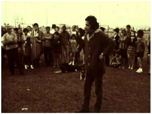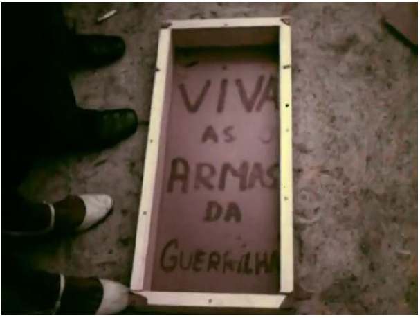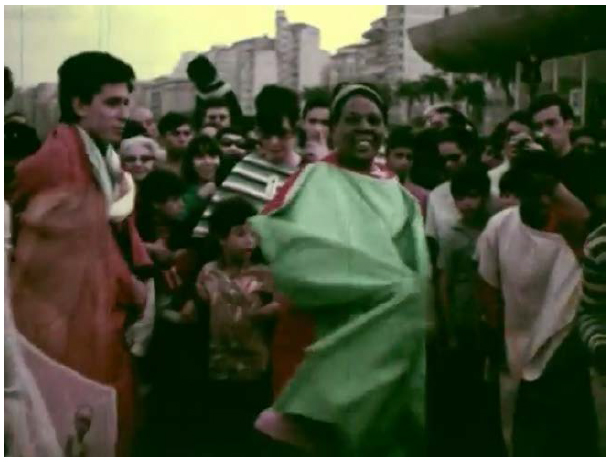 Em sequência posterior, vemos algumas das implicações das tentativas de se valer do espaço real, “não-metafórico” e, novamente, da improvisação. Como em Apocalipopótese, Glauber situa o “jogo” desta sequência no espaço da rua, abrindo-a não apenas à participação e improvisação dos atores, como ao público e ambiente que toma a cena.