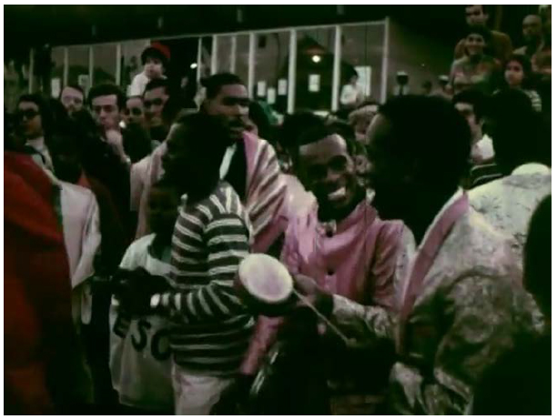 Nesta encenação improvisada na rua, o “incontrolável do mundo” (BURCH, 2008, p. 145) se faria ainda mais presente no espaço do quadro, já que a própria relação com o espaço fora-de-campo torna-se imprevista neste ambiente aberto. Os limites do quadro se mostram em seu caráter convencional, já que deliberadamente vulneráveis ao fora-de-campo. A mise-en-scène desta sequência se volta exatamente para a ênfase possibilitada pela filmagem na rua e chega a se desfazer do parco desenvolvimento dramático desenvolvido nas sequências anteriores. De uma tentativa de registrar uma espécie de teatro de rua ou happening (ARAÚJO SILVA, 2010, p. 70), a sequência passa a registrar o que era externo à encenação. Mais uma vez vemos esta passagem entre um registro ficcional para um documental, do qual o filme se nutre. Como na Apocalipopótese, Glauber busca estender suas proposições experimentais no sentido de uma participação coletiva, no espaço cotidiano, onde o público poderia se aproximar com maior disponibilidade e naturalidade. Uma arte ambiental, como afirmaria Oiticica (1986, p. 80), poderia fazer exprimir a manifestação criativa de uma coletividade. Porém, em Câncer, ainda permanece um desnível evidente de participação entre os artistas propositores e público (aquele que presencia a tentativa de encenação na rua). Nesta sequência vemos, no entanto, que, se a aproximação realizada, em razão deste desnível, não servia aos mesmos propósitos das Manifestações Ambientais - de catalisar “vivências” dos espectadores, abertos à interferência do imponderável -, servia como uma amplificação das regras do “jogo” de Câncer. O recurso falhado à participação do público em um espaço aberto desloca ainda mais a tentativa de ficção para um polo espontâneo, de atenção ao acaso, às presenças e transformações dos corpos em cena.