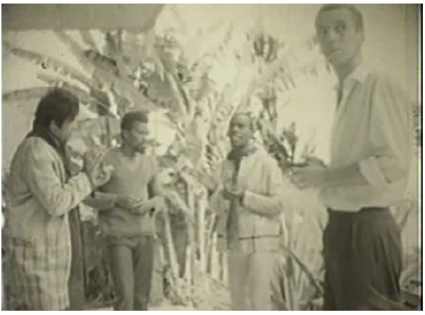 Deste modo, dar-se-ia a ver também com grande ênfase a transformação dos corpos no tempo da filmagem que, assim, exprimiriam diversas formas, como nos demais filmes de um “cinema do corpo” (DELEUZE, 1990, p. 227-266), um terreno em que o filme de Glauber poderia ser melhor compreendido13. Como podemos ver nessa sequência, esse cinema do corpo daria enorme atenção para as transformações dos corpos nas passagens de um polo cotidiano (os corpos livres em cena, hesitantes) para um polo cerimonial (o comprometimento desses corpos com a naturalidade, a ficção, a temática da violência) e vice-versa, que nunca se completa. Esta obsessão produzida pelo próprio “jogo” do filme nos mostraria com intensidade as esperas, os cansaços, os relaxamentos - as marcas do tempo nas atitudes e posturas dos atores ao se teatralizarem -, permitindo-nos perceber as disjunções entre corpo e personagem, voz e texto14.