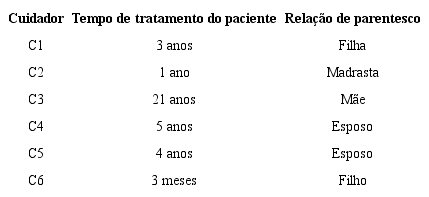 A fim de manter o sigilo dos participantes do estudo, seus nomes foram substituídos pelos códigos C1, C2, C3, C4, C5 e C6, nos quais a letra C significa cuidador e o número, a ordem dos cuidadores entrevistados.