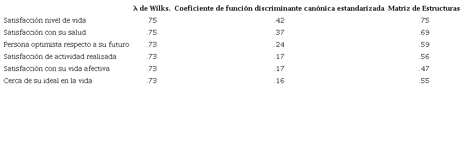Después de los análisis descriptivos bivariantes se estableció por separado, y finalmente en conjunto, si las variables satisfacción por dominios, eudaimonía, plenitud y de balance de afectos diferencian a satisfechos e insatisfechos en mexicanos con una deficiencia motriz a través de un análisis de la función discriminante. Se procede inicialmente llevando a cabo análisis discriminantes para cada una de las dimensiones por separado, iniciando con los dominios de la satisfacción, siguiendo con eudaimonía , balance afectivo y plenitud para obtener, a través de estas, las variables que discriminan en cada uno de los factores e incluirlos en una ecuación final discriminante que se presenta en la tabla 1, la cual nos indica las variables que discriminan a los grupos de satisfechos e insatisfechos en personas con problemas motrices.