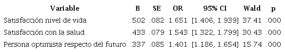 Después de establecer que variables discriminan, a los satisfechos e insatisfechos, se llevó a cabo un análisis de regresión logística, donde resultó un modelo con un valor de r2 de .63, lo que permite concluir que las variables predictoras integran un modelo con un poder predictivo adecuado. Los valores de los coeficientes Betas fueron significativamente positivos, lo que significa que la probabilidad de pertenecer al grupo de satisfechos se incrementa en la medida que se presenta satisfacción con el nivel vida, satisfacción con la salud y ser una persona optimista respecto a su futuro. Asimismo, la mayor probabilidad de pertenencia al grupo de satisfechos está dada por la condición de estar satisfecho con el nivel de vida de estas personas con deficiencia motriz (ver tabla 2).
