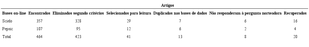 A busca nas bases on-line ocorreu em 4, 5 e 12 de maio de 2015, tendo retornado na base Scielo 357 artigos, dos quais 328 foram eliminados por não preencherem os critérios de inclusão, restando 29, os quais foram selecionados para leitura dos resumos. Destes 29 artigos, sete foram eliminados por repetição e seis por não responderem à pergunta norteadora, restando, portanto, 16 referências para leitura na íntegra (Tabela 1). Já na busca feita na Pepsic/BVS, foram encontrados 107 artigos inicialmente, dos quais 95 foram eliminados pela aplicação dos critérios de exclusão, seis por repetição e dois por não responderem à pergunta norteadora, restando, portanto, quatro referências para leitura na íntegra. Logo, no total, foram selecionados nas duas bases 20 artigos para leitura na íntegra (Tabela 1), os quais compuseram o corpus de análise. De cada um desses 20 artigos, foram extraídas informações para preenchimento de uma planilha de acordo com orientações de Broome (2000) quanto a: a) ano de publicação; b) fonte de publicação; c) tipo de estudo; d) amostra; e) objetivos e f) principais resultados de cada artigo. Esta planilha foi discutida por dois pesquisadores e chegou-se a um consenso em relação à exatidão das informações.