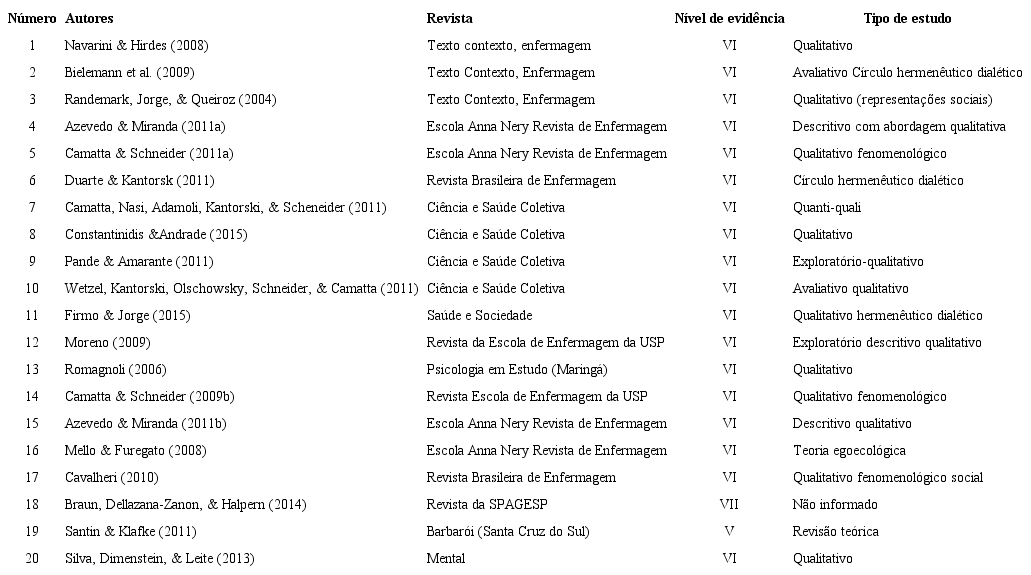 Dentre os 20 artigos recuperados, a publicação mais antiga foi efetuada em 2004 e a mais recente data de 2015, com concentração de artigos publicados em 2011. Apenas neste ano, foram publicados oito dos 20 artigos recuperados, totalizando quase metade da amostra total. Já nos anos anteriores, entre 2004 e 2010, foram encontrados nove artigos e, após 2011, foram encontrados apenas três artigos, um em 2013 e dois em 2015. Os periódicos são principalmente de áreas da saúde (sendo em sua maioria da Enfermagem, porém há artigos publicados em revistas de Saúde Coletiva e Saúde Mental) e periódicos de Psicologia (área de humanas).