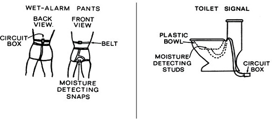 Os primeiros estudos relatados de Azrin e colaboradores foram publicados em 1971. Em um desses estudos, Azrin, Bugle e O’brien (1971) criticaram o aparato de alarme urinário desenvolvidos por Van Wagener e Murdock (1966). Os autores ressaltaram a falta de dados experimentais sobre a eficácia do aparato e sugeriram dois dispositivos (Figura 1) que, segundo eles, possuíam design mais simples e eram mais econômicos e resistentes. O primeiro aparato era um sensor acoplado à roupa íntima do participante e que enviava um sinal para um alarme sonoro acionado ao primeiro sinal de eliminação inadequada. O segundo aparato era um vaso de plástico acoplado ao vaso sanitário que emitia sinal sonoro quando a eliminação adequada ocorria (fezes ou urina).
