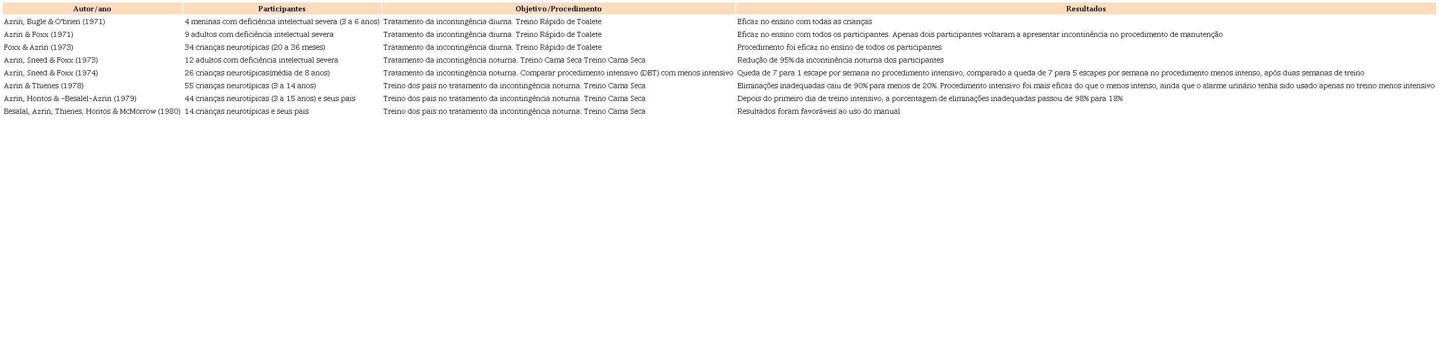 Fontes e descritores: as buscas ocorreram no Portal de Periódicos da Capes. Os descritores utilizados na busca foram: “toilet training”, em qualquer parte do artigo, e “Azrin”, como um dos autores. Não houve limite de ano na busca das publicações. Também foram pesquisados, nas referências de estudos experimentais e de revisão recentes sobre o tema, artigos que apresentavam Azrin como um dos autores.