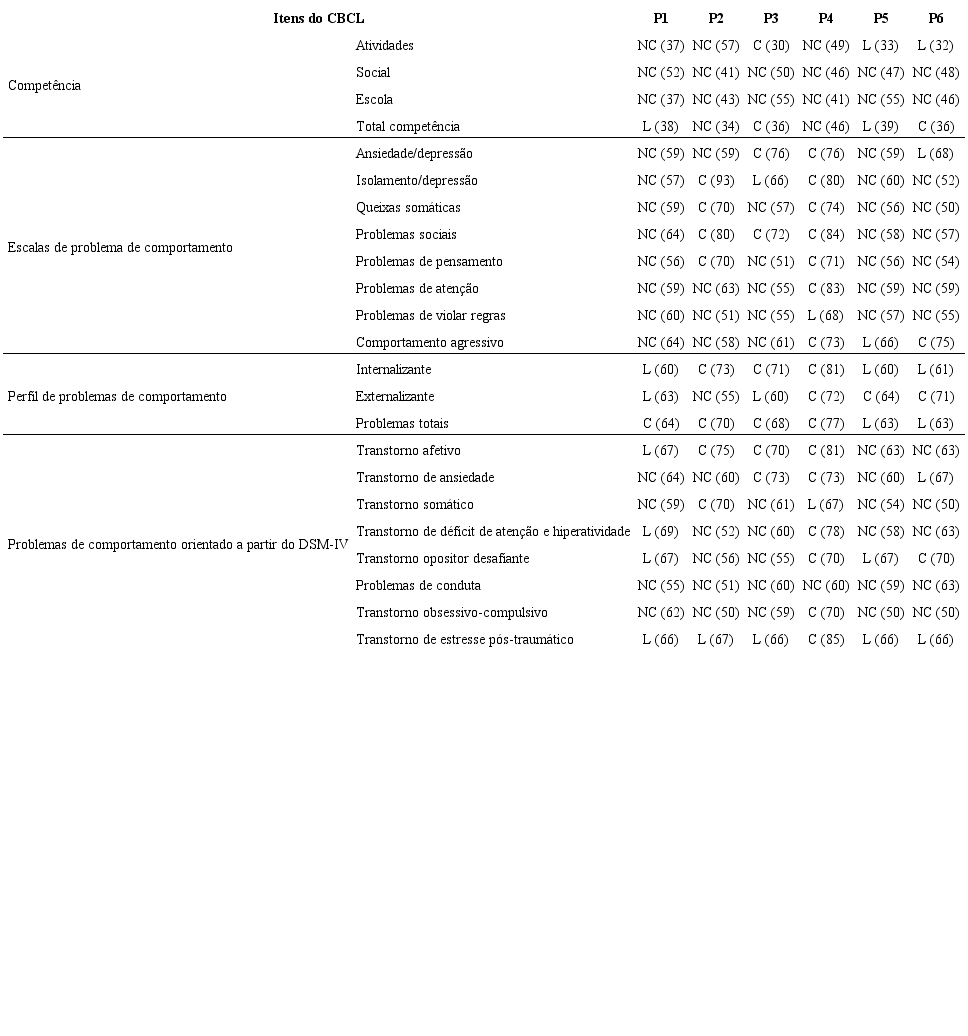Corroborando as queixas apresentadas na entrevista com as mães, os resultados do CBCL indicaram perfil de problemas de comportamento, totais clínicos (P1, P2, P3 e P4) ou limítrofe (P5 e P6) e escore de competência limítrofe (P4, P5 e P6) ou clínico (P1, P2 e P3) para as participantes (Tabela 1).